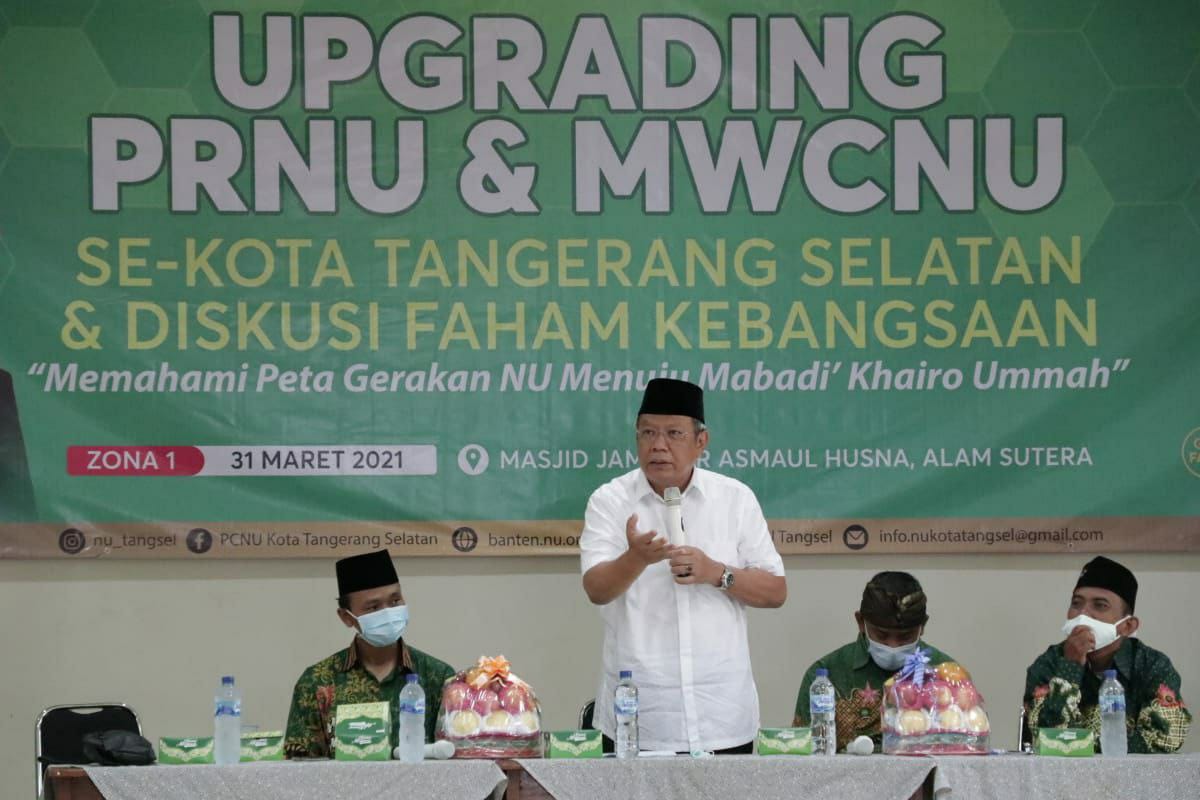 TANGSEL – Wakil Walikota Tangerang Selatan Benyamin Davnie membuka acara upgrading Pengurus Ranting Nahdlatul Ulama (PRNU) dan Majelis Wakil Cabang NU (MWCNU) se-Tangsel. Acara tersebut diselenggarakan di Masjid Nur Asmaul Husna, Serpong Utara, Tangsel, Rabu (31/3/2021).