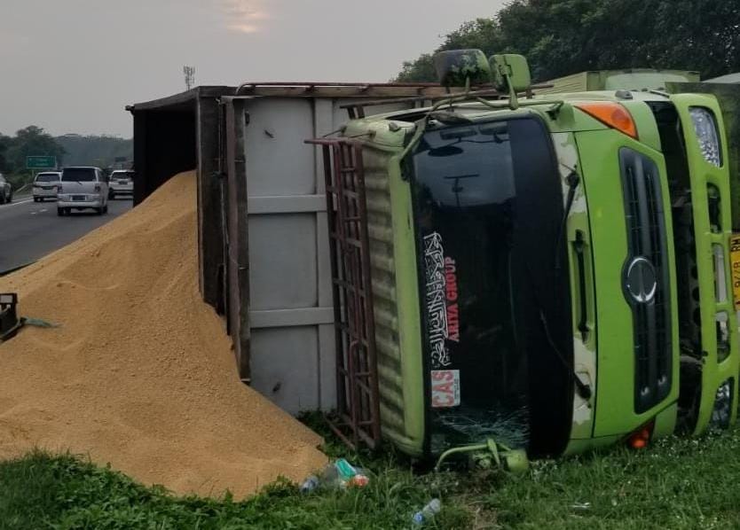 “Kemudian dari pengakuan pengemudi setibanya di TKP kurang jaga jarak menghindari kendaran kecil yang berhenti mendadak lalu banting setir ke kanan hingga median dengan posisi akhir kendaraan terbalik miring dengan kedua roda kiri diatas menghadap timur median,” jelasnya.