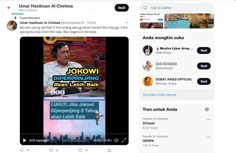 “Kemarin dua tahun, sekarang tiga tahun. kenapa gak sekalian saja 1.000 tahun lamanya jika berkuasa. Kalian makin lama makin seenak perut saja ngurus negara ini,” katanya melalui akun Twitter pribadinya @umarsyadat75 pada Sabtu, (12/3/2022)
