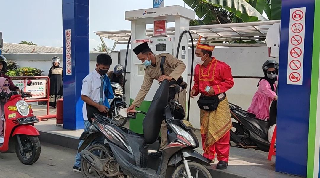 SERANG,- Ada yang unik di salah satu stasiun pengisian bahan bakar umum (SPBU) di Taman Kopasus, Kecamatan Taktakan, Kota Serang. Para petugas mengenakan baju adat daerah dan kostum pejuang di era kemerdekaan indonesia.