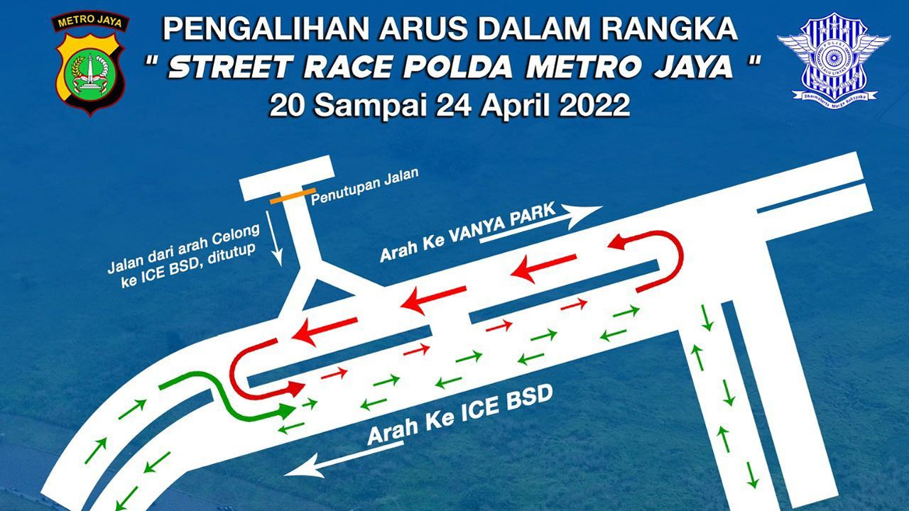 TANGSEL – Polda Metro Jaya akan menggelar street race 2022 untuk pembalap motor dan mobil di Kawasan BSD, Tangerang Selatan selama tiga hari berturut-turut. Selama pelaksanaan street race ini, lalu lintas di Jl Grand Boulevard BSD akan dialihkan.