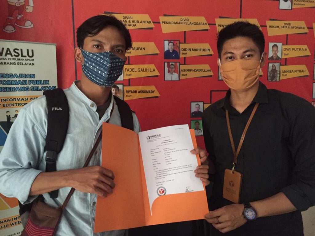 Diketahui, pelaporan JPMI tersebut, kata Andi, diterima anggota Bawaslu Tangsel, Riyadi Assomady, bernomor 031/PL/PW/Kota/11.03/X/2020. Adapun bukti pelaporan tersebut berupa, 1 buah print riwayat hidup atas nama Rahayu Saraswati dan Ruhamaben.